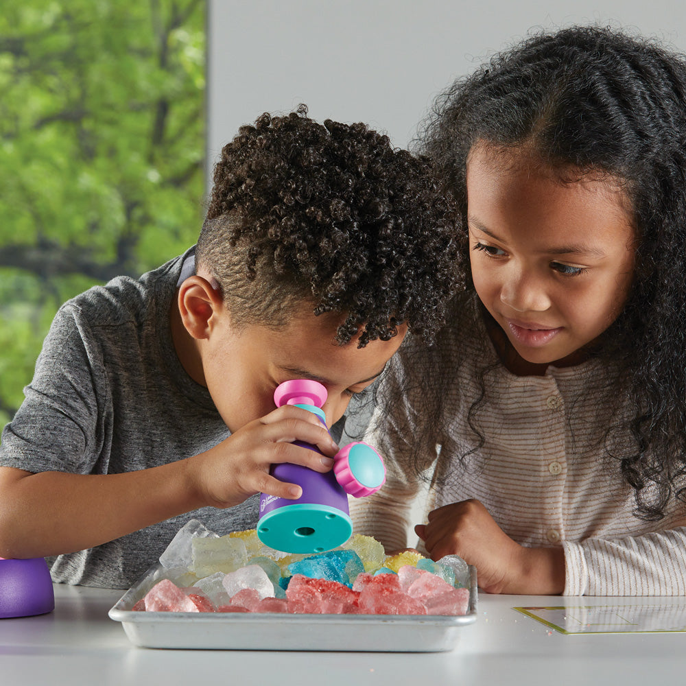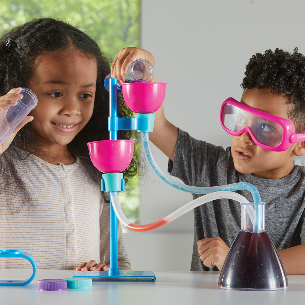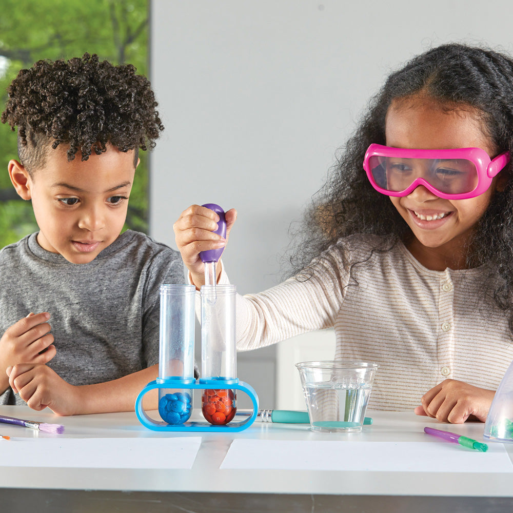 Our bestselling science kit for kids, now in pink! Kids learn experimentation, observation, and other essential STEM skills when the dive into science with the Primary Science Deluxe Lab Set from Learning Resources. This 45-piece deluxe science kit gives kids the tools they need to start performing real kids’ science experiments with common household ingredients—pieces include a Primary Science ViewScope with observation dish, two flasks, two large test tubes and stand, two funnels, safety glasses, a tall stand with adjustable holder clips, a sensory tube with solid and vented lids, and more. Modeled on real-world science tools, these kid-friendly versions get put to good use during the step-by-step science experiments for kids found on the set’s 20 activity cards—learn about color mixing, make rainbow ice, paint with candy, and more! The Primary Science Deluxe Lab Set works with all of our Primary Science sets, and is ready for use both at home and in concert with STEM toys for classroom learning.