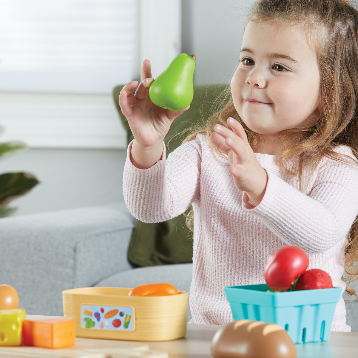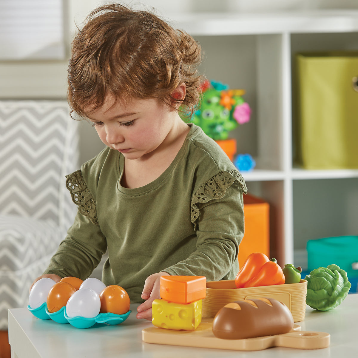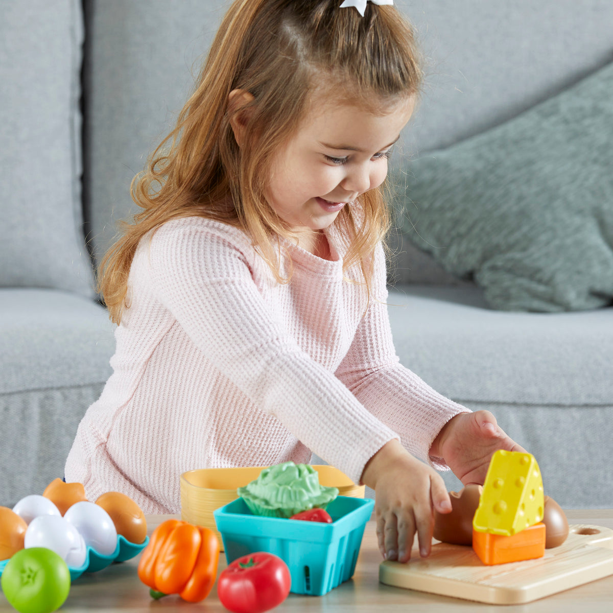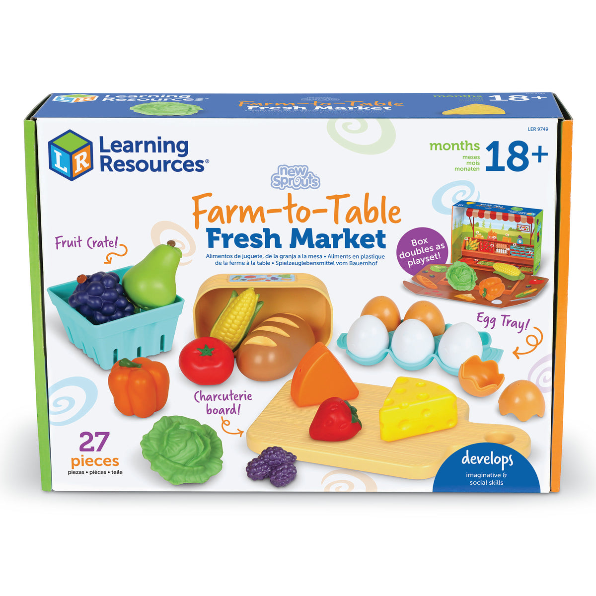 Discover a fresh and delicious take on play food! Kids strengthen their imaginations while building essential social and vocabulary skills with New Sprouts Farm-to-Table Fresh Market, one of the bestselling play food collections from Learning Resources. This 27-piece set comes with all the ingredients kids need for their next pretend feast or grocery store pretend play, including veggie crate, berry container, trendy charcuterie board, two-piece crackable eggs, and realistic food pieces. Sized for little hands, each piece of play food for kids’ kitchens is made from durable, wipe-clean plastic that's ready for years of play! This preschool learning toy makes a great addition to home and classroom play kitchen accessories!