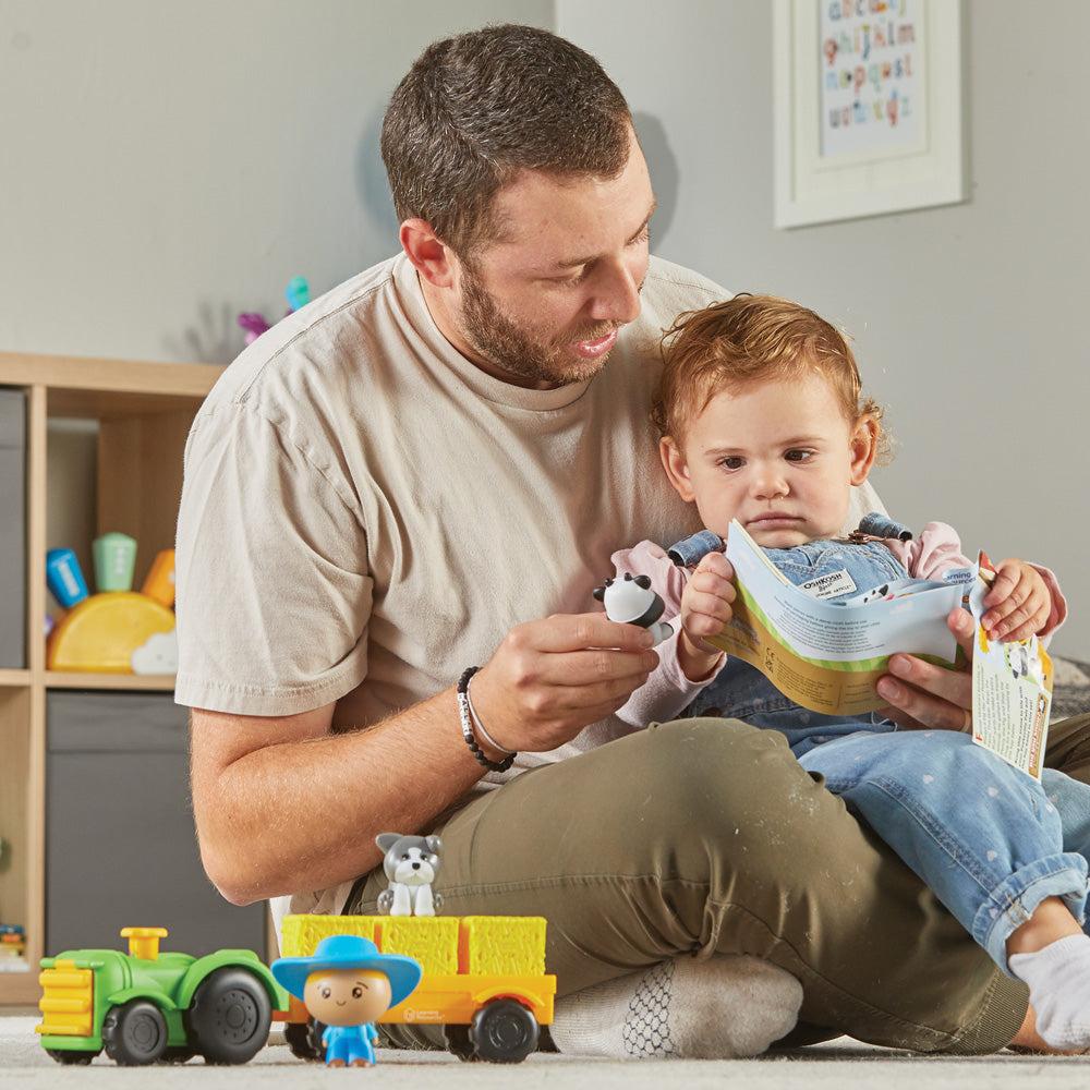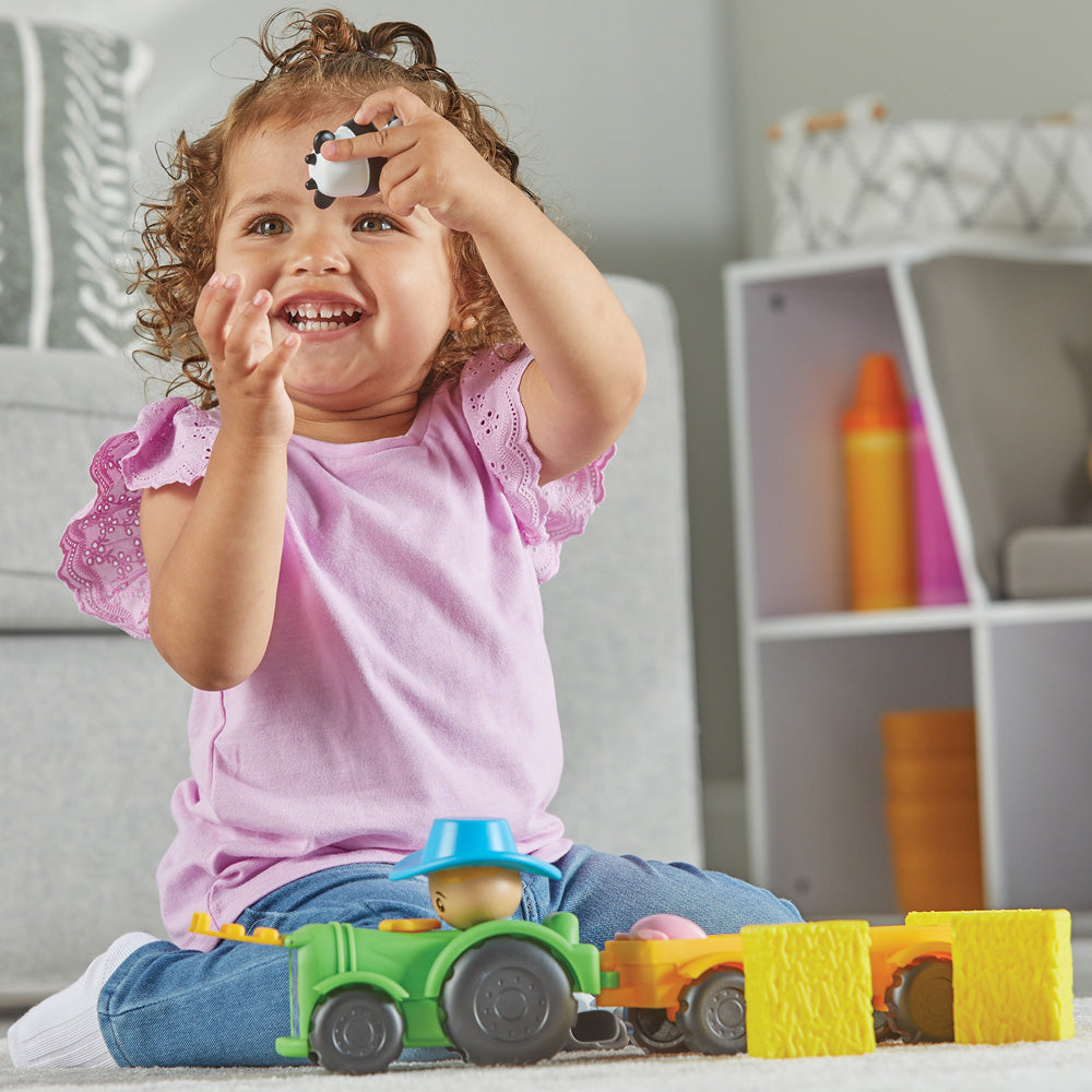 Looking for an easy way to help kids learn preschool fine motor skills? Check out this tractor toy's crew of peekaboo farmyard friends! This rolling tractor packs a bunch of fine motor surprises—pull the cart, pop the exhaust pipe, lift the grille, and more! How does this peekaboo toy help kids learn? Hide this preschool toy's farm animal friends under a bale of hay for memory-building games of hide-and-seek or peekaboo, or just take them for a ride in the tractor! Best of all, this toddler learning toy also includes a storybook activity guide filled with Peeksville learning adventures. Made from durable plastic, the Peeksville Haul & Seek Tractor makes an easy addition to collections of farm toys, barn toys, and Montessori toys for kids.